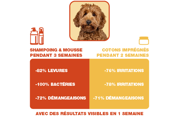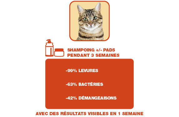 La levure Malassezia se développe dans un écosystème cutané déséquilibré ; il est scientifiquement prouvé que DOUXO® S3 PYO, contenant 3% de digluconate de chlorhexidine, ramène le nombre de levures à un niveau normal en 3 semaines, avec une amélioration significative dès 7 jours.